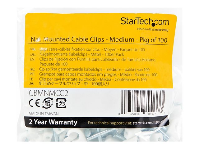 Startech 100 Pack Cable Clips with Nail, Reusable, Nail-in Clamps, Wire Holding Clips, CAT5/CAT6 Ethernet Cord/AV/Coax Cable Fasteners, Brick/Drywall Mounting Cable Tacks, White, TAA